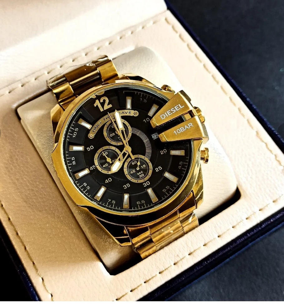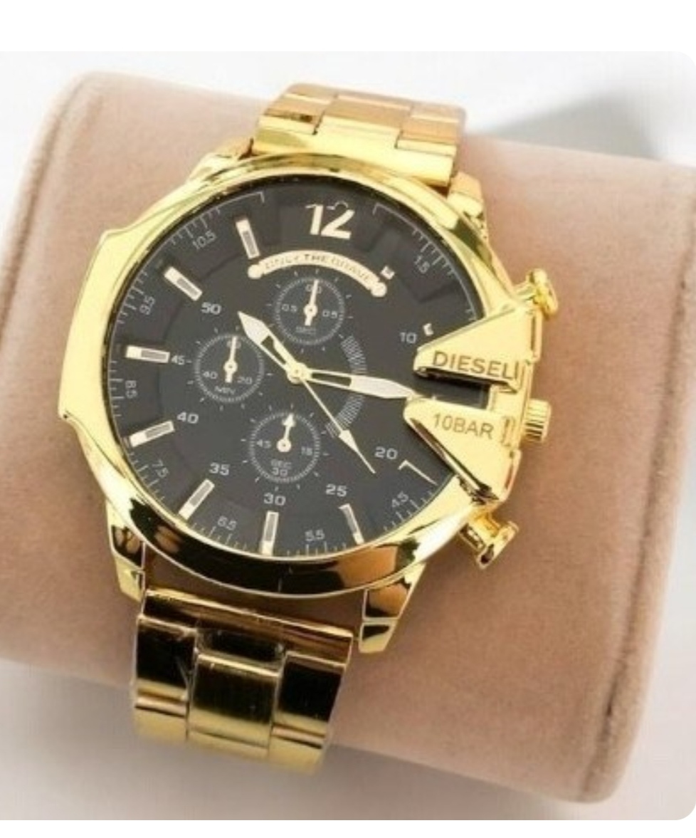 ساعت مردانه مدل دیزل شاخدار فلزی بدنه طلایی صفحه مشکی دارای روز شمار تقویم ضد حساسیت قفل کلیپسی شیک و زیبا های کپی شرکتی درجه یک